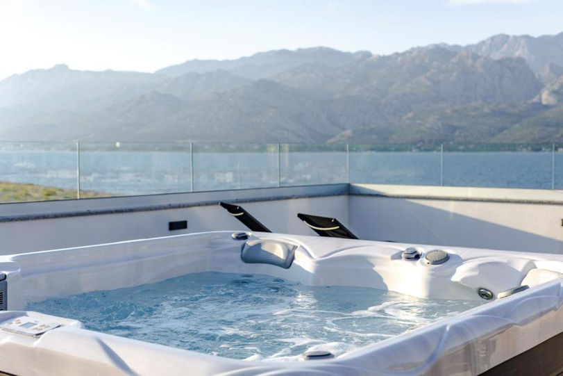 Entspannen Sie im privaten Whirlpool oder auf der großzügigen Terrasse mit Blick auf das Meer.